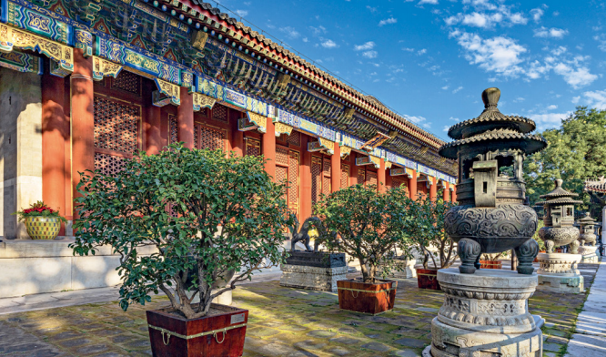 東門の内側にある勤政殿は、その二十八景の筆頭であり、乾隆帝が政務を執った場所。そこから山道を北へ登れば、約20分で香山寺に至る。この古寺は清代の最盛期には3万平方㍍を超える規模を誇ったが、英仏連合軍と8カ国連合軍(注:1900年に英・米・独・仏・ロ・日・伊・オーストリア=ハンガリー帝国によって結成された軍隊が中国侵略を行った)により破壊され、2017年に再建・公開された。秋になると、古寺と紅葉が織りなす景観(3)は撮影や観光に最適である。