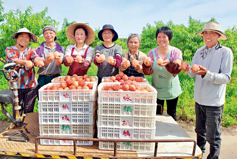 桃咏桃業専業合作社は複数の合作社と協力して合作聯社を立ち上げた。桃の最盛期には1日の注文数が2000~3000件に達し、少なくとも2万個の桃が出荷される。新場鎮には三つの優良農産物モデル栽培拠点が建設され、南匯水蜜桃を中心にスイカ、ナシ、ブドウなどの優れた品種を組み合わせた栽培体系を確立されている。合作社は「企業+農家+栽培拠点」の生産販売モデルを通じ、760世帯余りの果樹農家を連動させて共同生産・共同販売を行い、標準化栽培と規模化販売を実現し、1ムー当たりの収益を過去のピーク時の8000元余りから2万元余りにまで向上させた。
