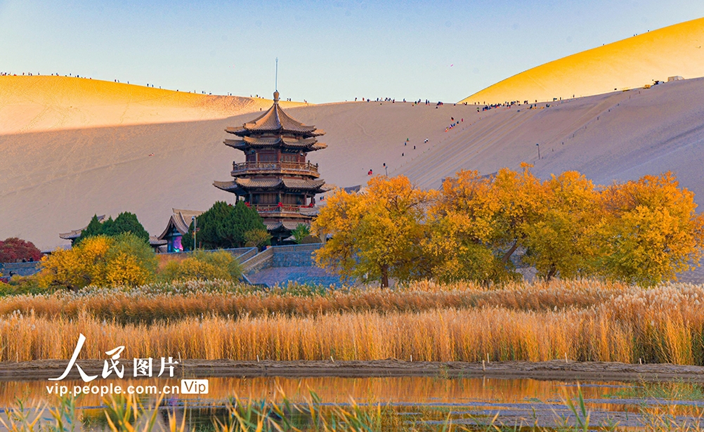 甘粛省敦煌市の鳴沙山の麓では、秋の風情が深まり、多くの観光客が、この広大な砂漠の魅力溢れる秋景色を鑑賞するために訪れている。人民網が伝えた。