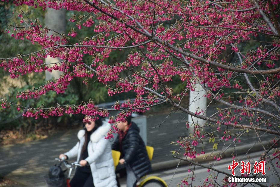 武漢大学の早咲きの桜、鮮やかな色合いで人々を魅了