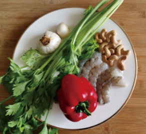 ①百合根は一片ずつはがし、葉を取った中国セロリは5cmほどの長さに斜め切り、パプリカも同じくらいの大きさに切る。エビは殻をむき背わたを取る。