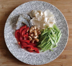 私の創作料理です。旬の柔らかい中国セロリと百合根に新春をイメージしたおめでたい色合いのエビとパプリカを合わせ、カシューナッツで風味と食感をプラスしました。