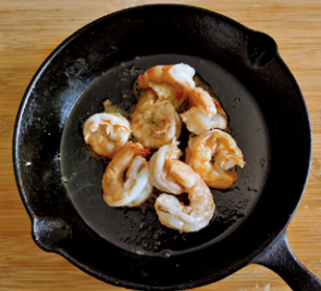 ②鍋を熱して花椒油を入れ、エビを強めの火で炒める。